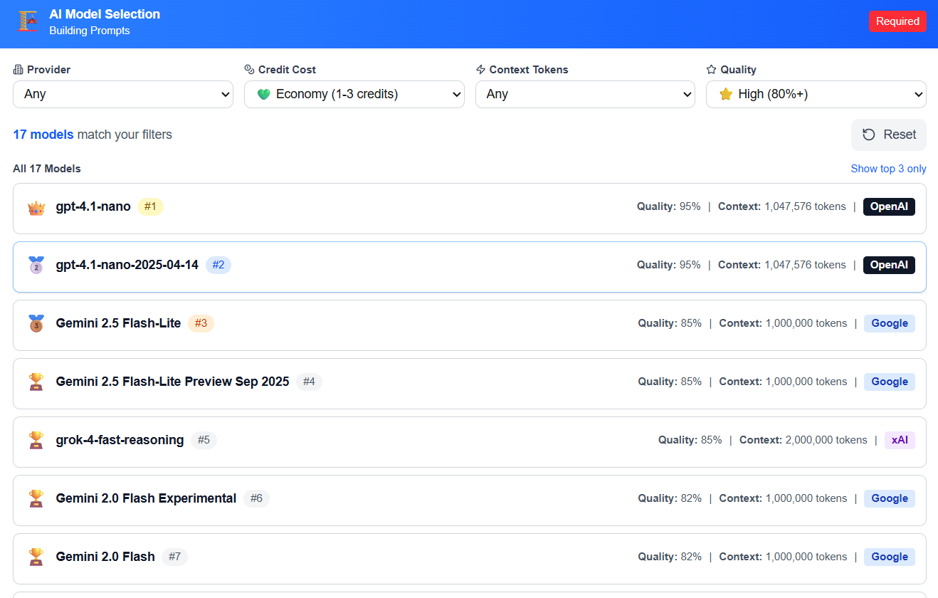 With BYOK enabled, prompt building uses your API access instead of platform credits—so you can build unlimited prompts and pay your AI provider directly at their rates. It’s ideal for heavy users who want predictable costs and maximum control.