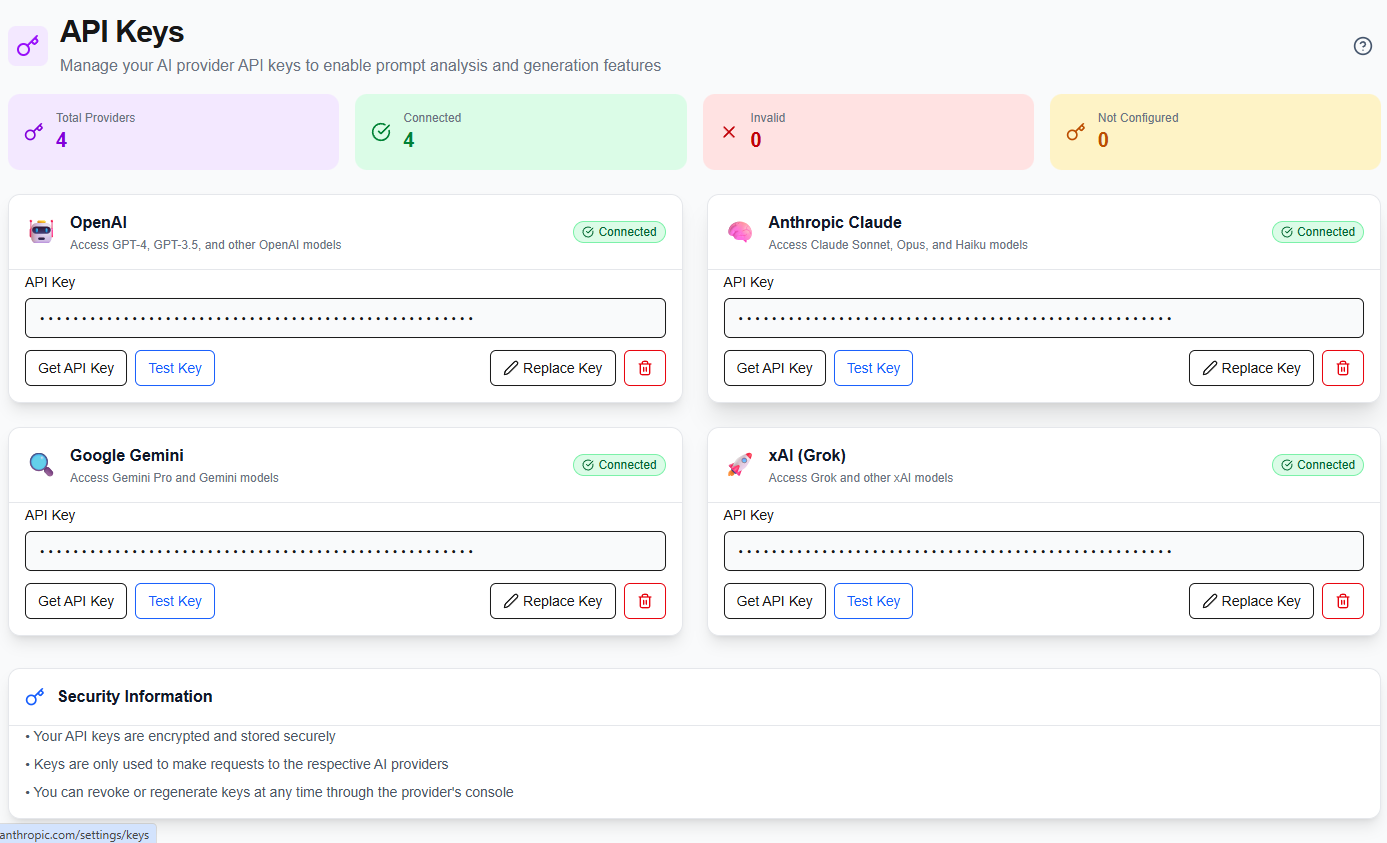 Benefit: Connect your own API keys and build unlimited prompts without platform credit limits. Pay your AI provider directly at their rates.