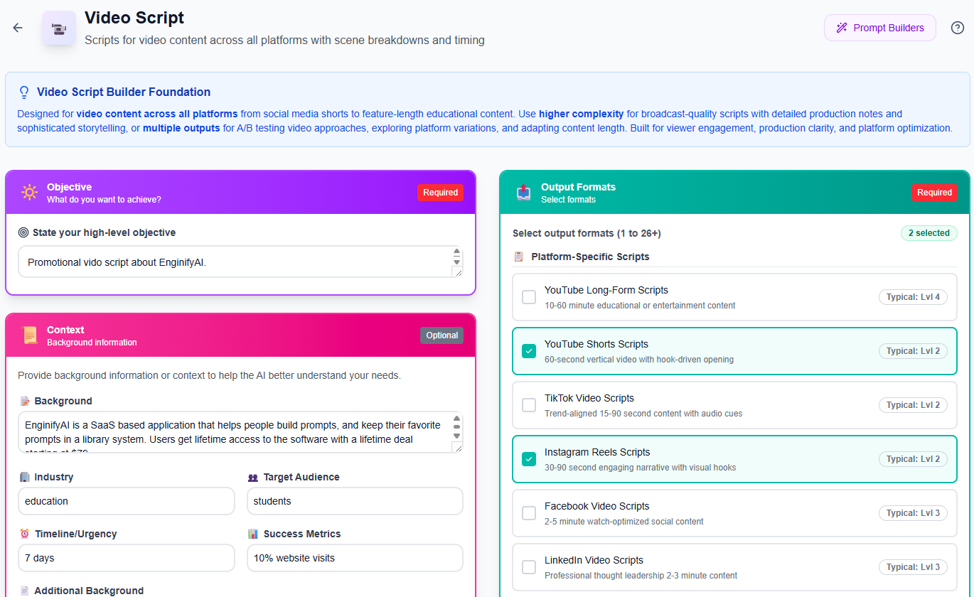 EnginifyAI’s builders guide you through including the context, constraints, and structure that make prompts actually perform. And every prompt you build gets saved, organized, and ready for reuse. The platform pays for itself in time saved on your first few projects.
