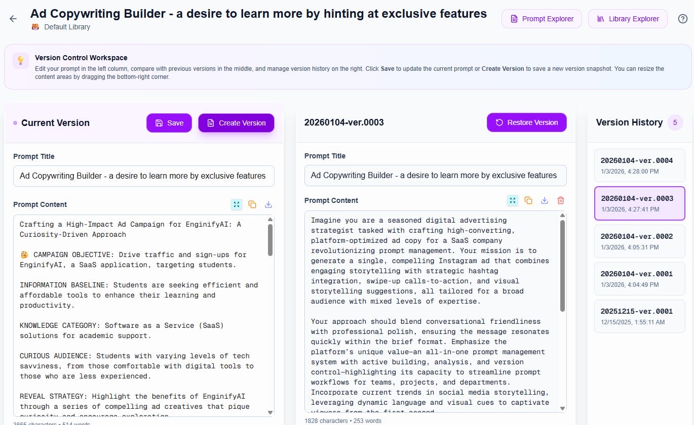 Benefit: Track how your prompts evolve. Compare versions, restore previous iterations, and understand what changes improved your results.